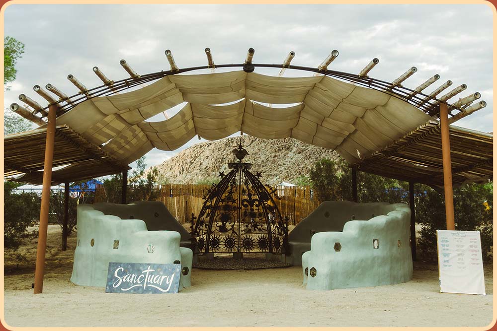 Look around the festival site and you’ll notice that we’ve got a passion for repurposing. From barn wood and garage doors to car gears and bike chains, we love giving salvaged objects new life and think they add special character to the festival site. Our Beer Garden bar, built by local artist Guy Green, is constructed entirely from gathered timbers, bottles and local clay. Earthen benches in the Music Bowl and Sanctuary were made with local earth and collected bottles. Satellite dishes and water tanks become shade structures, second hand garage doors become roofs and we utilize paint that would otherwise be thrown away.